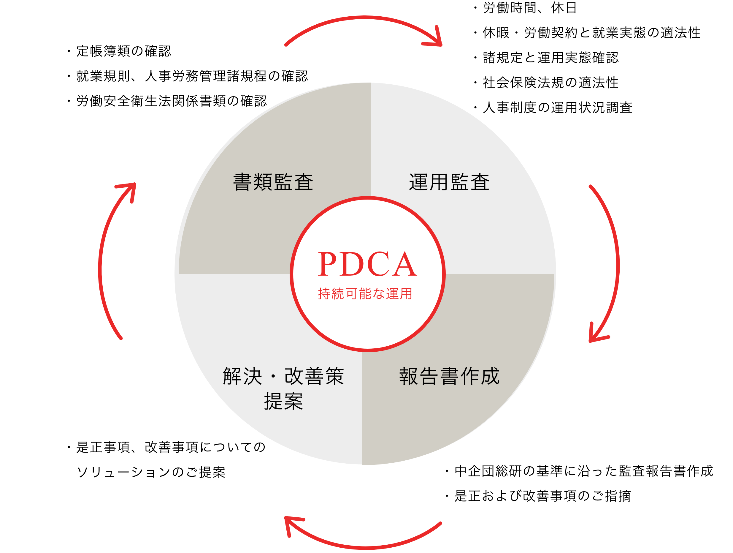 人事労務関係の規程・協定・法定帳簿などの整備、状況の監査をします。
